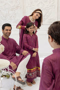 This maroon kalidar kurta channels sophistication with its V-neckline adorned with loop buttons and long fitted sleeves. The matching izaar adds balance and depth, creating a streamlined look. Regal in tone, yet effortlessly wearable, it’s a versatile choice for those seeking a classic, refined silhouette that works for both intimate and formal occasions.