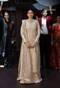Breathtakingly gorgeous, this beige ensemble is a vision of timeless refinement. The front-open jacket-style shirt is a delicate tapestry of dull ivory threads and glistening transparent sequins, creating a subtle play of light and texture. Scalloped detailing along the hem adds a graceful finish, echoing the soft allure of the overall design. Paired with a beautifully embroidered dupatta that drapes like a whisper, this look is effortlessly graceful—perfect for those who find beauty in the quietest details.