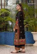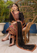 In the regal onyx ensemble, Hania Aamir exudes an aura of mystery and sophistication. The intricate hand embroidery in golden, pop of red and pink thread work adorns the entire ensemble, including the dupatta, while the broad border work makes it lavish. The culottes trousers and the shirt, made of viscose raw silk, are impeccably tailored, this ethereal piece from Asim Jofa’s ‘MERA HASEEN JORA’ truly captures the essence of luxury pret.