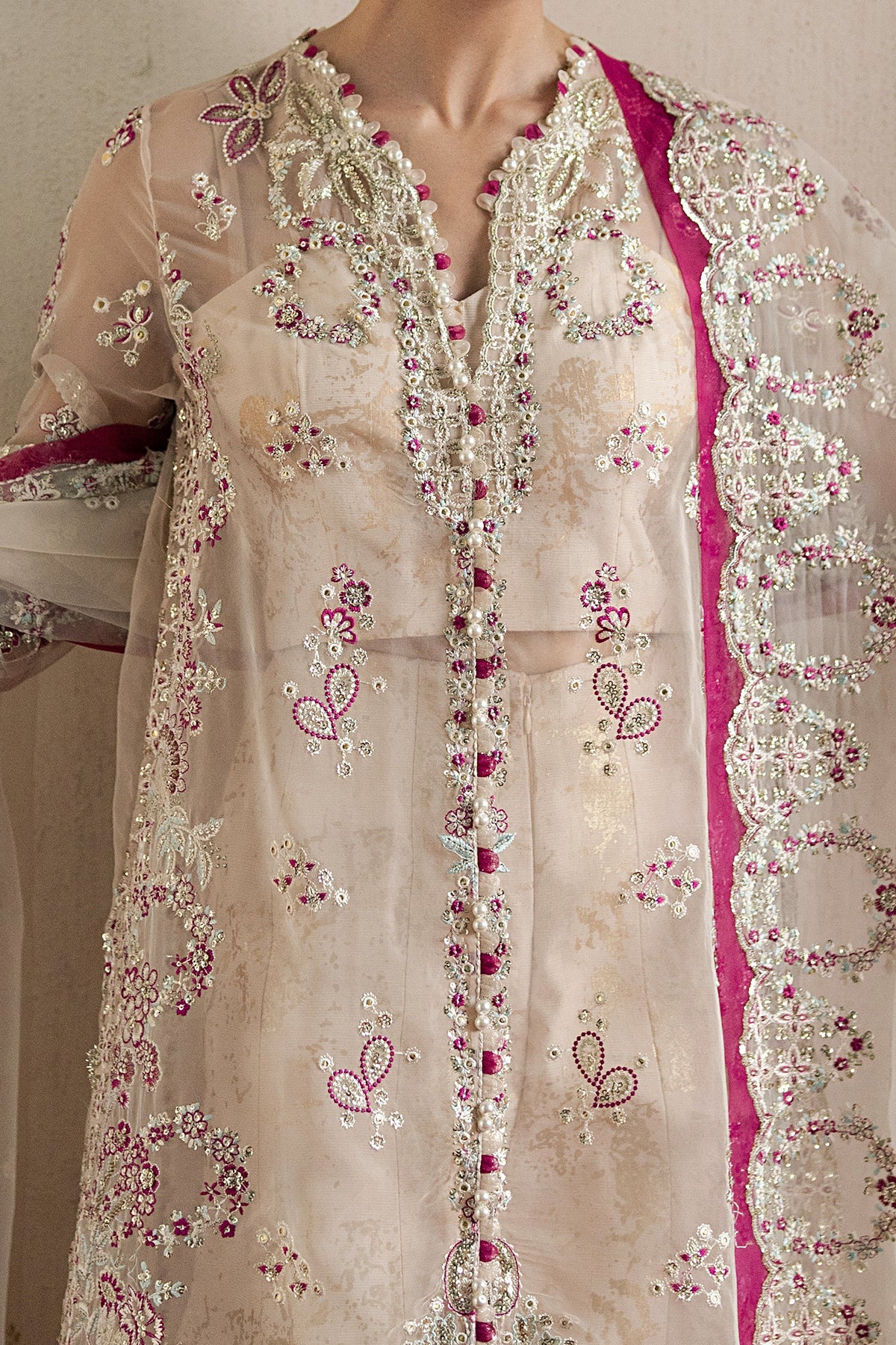This ethereal ivory ensemble is adorned with intricate threadwork and sequins in shades of fuchsia and silver. The long, graceful silhouette is complemented by sheer embroidered sleeves and scalloped detailing that adds a touch of refinement. Paired with a coordinated dupatta edged in bold fuchsia borders and delicate motifs, the look strikes the perfect balance between soft femininity and striking elegance. A timeless choice for festive occasions and evening celebrations where grace meets grandeur.