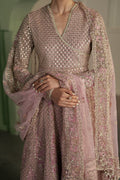 This enchanting blush ensemble is a vision of romance and elegance, crafted on delicate net fabric and lavishly adorned with silver and rose-gold embroidery that shimmers with timeless charm. The wrap-style bodice flows gracefully into a voluminous flared silhouette, while the sheer embroidered sleeves lend an ethereal touch. Paired with a coordinating dupatta finished with intricate borders, this ensemble exudes regal sophistication — perfect for weddings and festive occasions.