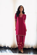 Introducing Fuchsia Grace – a vibrant magenta two-piece crafted from luxurious raw silk. Paired with a classic shalwar, this Diva outfit radiates elegance and sophistication, offering a perfect blend of rich color and timeless style.