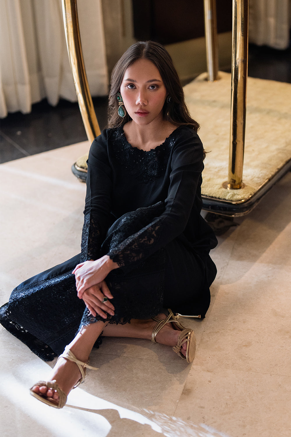 Introducing Mystic Dusk – a timeless black two-piece in luxurious raw silk. Designed for effortless sophistication, it features a sleek silhouette with a refined finish. Paired with classic straight pants, this Diva outfit exudes modern elegance, making it a versatile staple for any wardrobe.