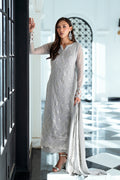 Ash Veil exudes subtle elegance in light grey chiffon, perfect for a refined Eid look. Delicate hand-embellished bunches on the neckline add a touch of sophistication, while the flowing chiffon dupatta and tailored trousers complete this graceful 3-piece ensemble with effortless charm. .