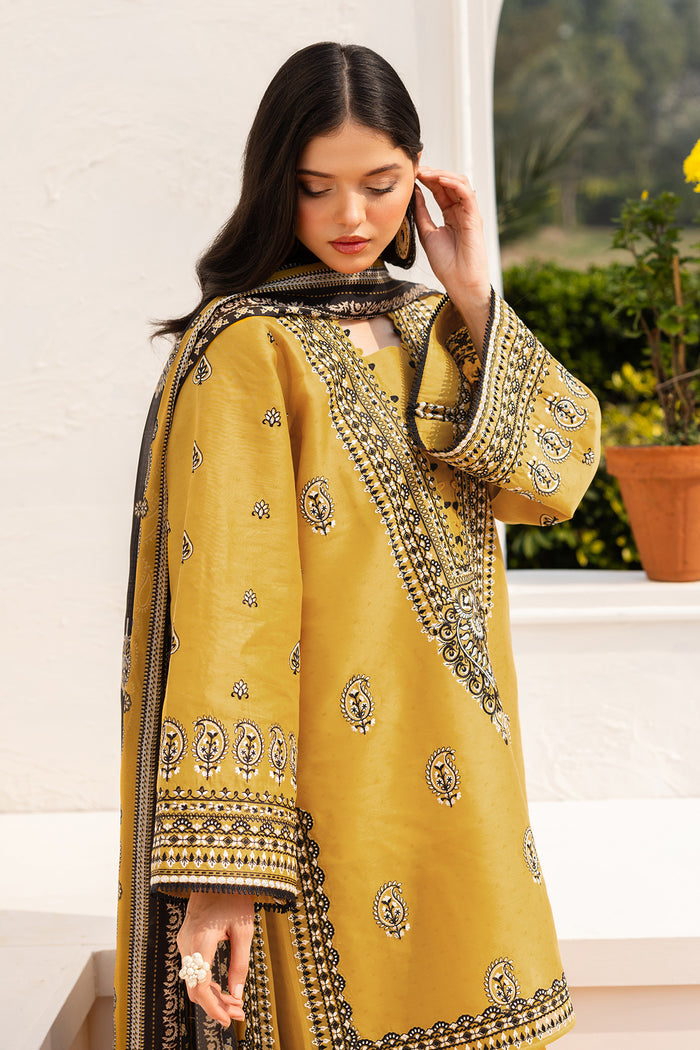 Crafted in bright hues, this lawn ensemble exudes grace. The shirt is adorned with embroidered details at front. The dyed cotton trouser complements the shirt seamlessly. A beautiful printed silk dupatta completes the look.