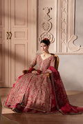 A breathtaking organza dupatta completes the look, lavishly embroidered with sequins to cast a soft, luminous sheen. Its borders are finished in contrasting tones and further embellished on all four sides to elevate its elegance. Draped effortlessly, this dupatta surrounds the bride in an aura of royalty and magnificence, making the entire ensemble a true statement of luxury.