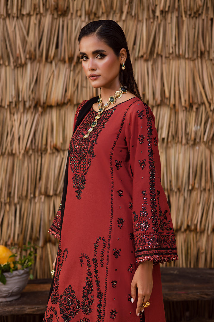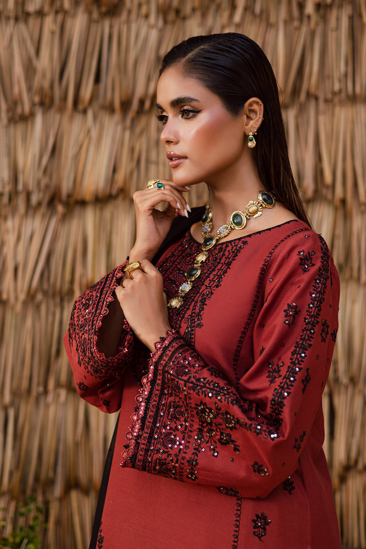 This heavily embroidered rust khaddar shirt stands out with sequin detailing, a geometric neckline, and traditional paisley motifs. The organza and khaddar embroidered borders bring depth, while crystals on the kavya-finished hem and flared sleeves add elegance with a subtle sparkle.