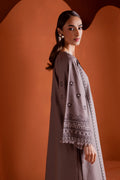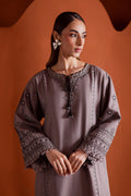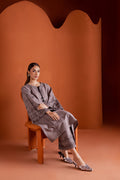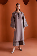 Step out in style with the Crossword two-piece khaddar set, featuring a drop shoulder paneled grey khaddar shirt adorned with intricate cross-stitch embroidery. The sleeves are finished with delicate fringes, while thread-embellished tassels accent the neckline, adding a playful yet elegant touch.