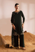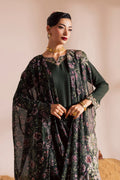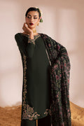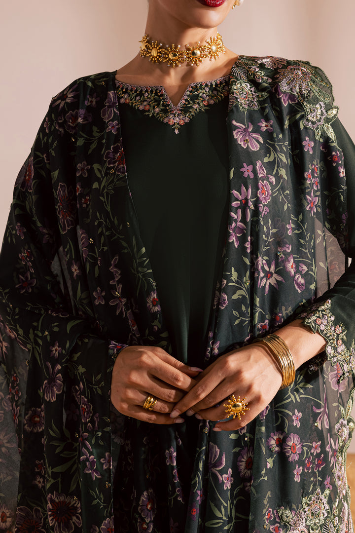 A formal embroidered dress featuring a short mid-length georgette dark army green shirt featuring a V-slit embroidered neckline, complemented by composed embroidery along the hem and side seams. The sleeves are finished with elegant embroidered borders, adding a refined detail to the design.