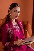 Discover understated elegance with the Inizio three-piece set, featuring a long rasberry pink embroidered khaddar shirt with a graceful rounded hem. The shirt showcases intricate embroidery along the neckline and sides, highlighted by a keyhole embroidered neckline adorned with a delicate front sequin spread. Fitted sleeves are finished with embroidered hems and self crochet lace, adding a refined touch.