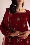 This formal embroidered dress features a georgette red shirt with a direct adda neckline, finished neatly at the hem with self-fold detailing. The sleeves are delicately embroidered and styled with borders at the hem, adding an elegant touch to the design.