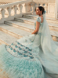 The lehenga, adorned with opulent sequin ripples, stone detailing, and exquisite hand-made butterfly motifs, is a vision to behold. The addition of frills at the end adds a playful touch, while the stylish organza dupatta completes this breathtaking look.