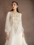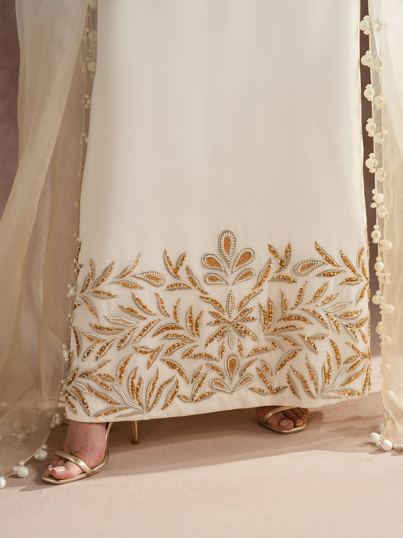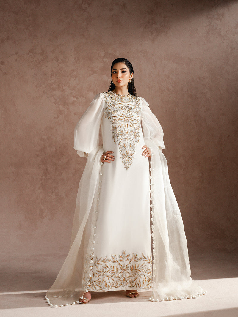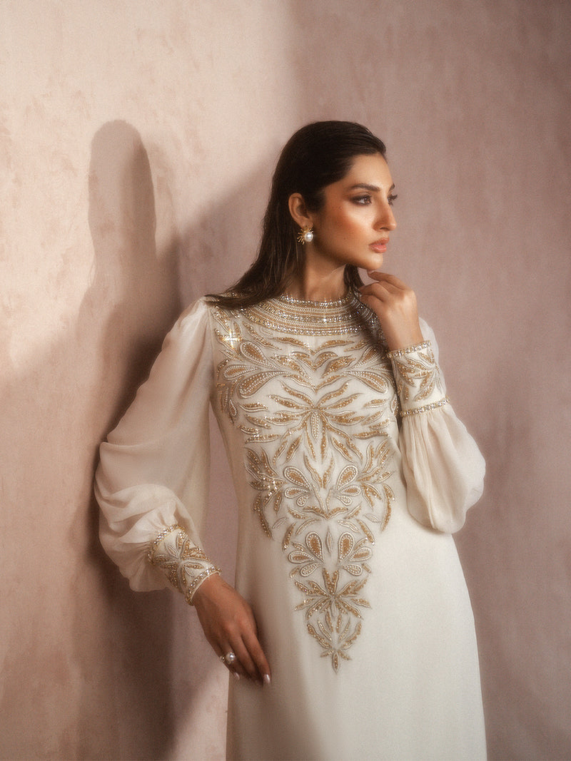 Gracefully flowing in chiffon, this dress is adorned with exquisite gold embellishments and a side slit and organza dupatta — a flawless fusion of sophistication and festive allure.