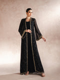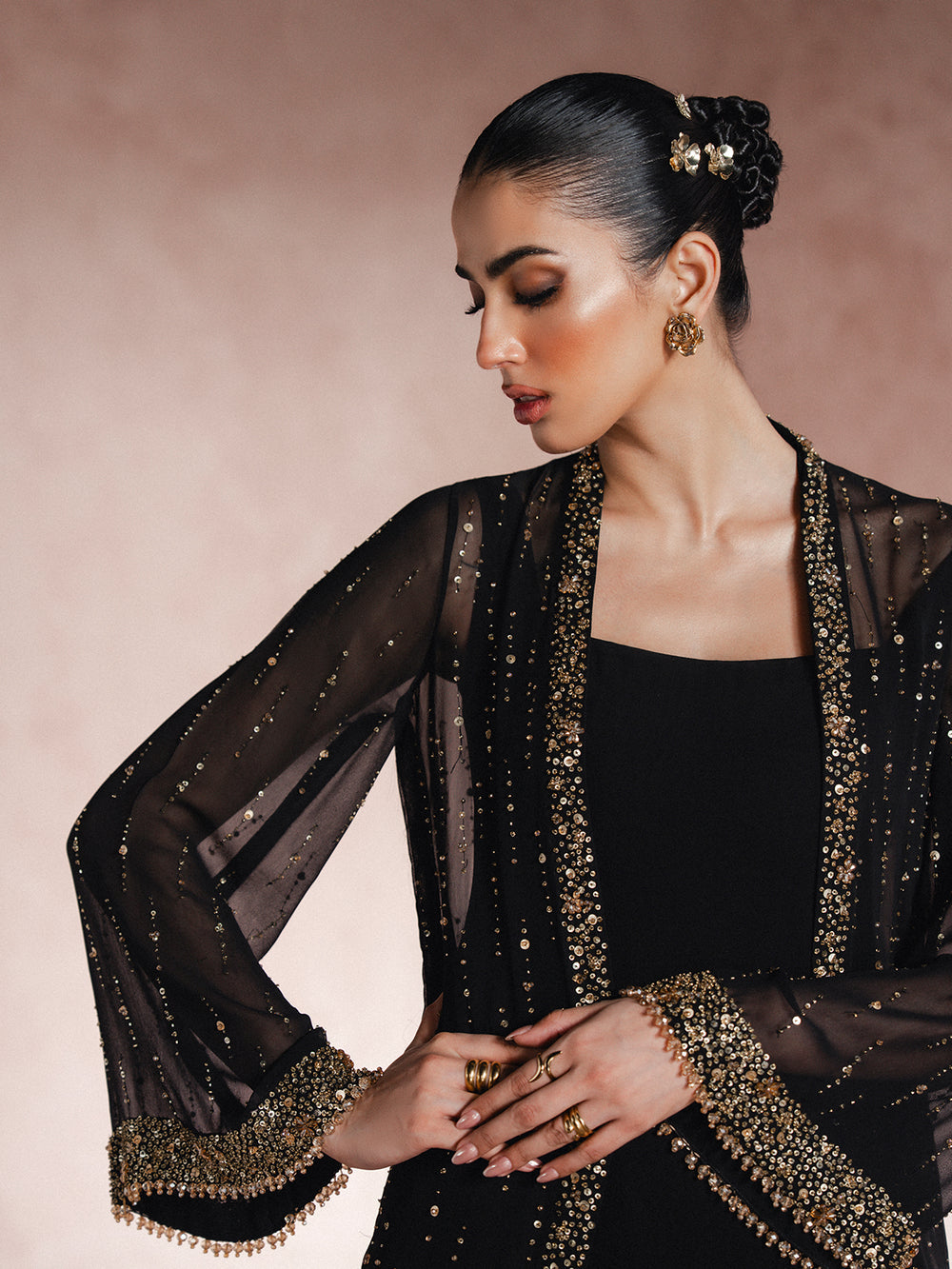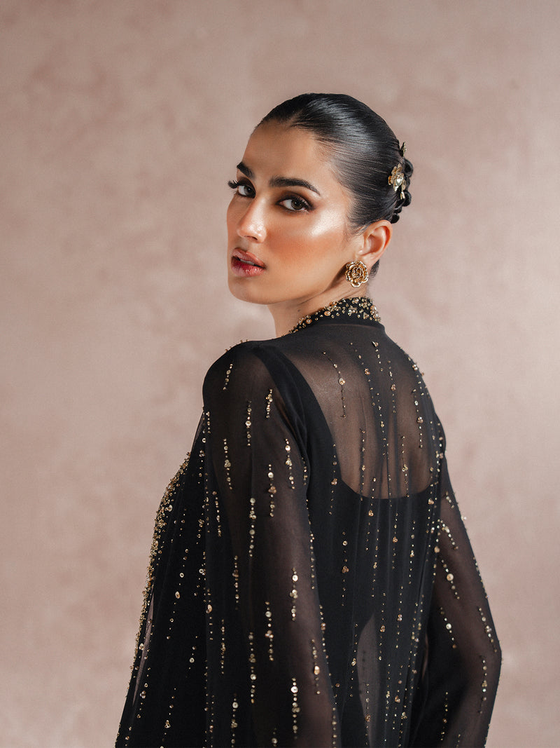 A black gown adorned with a galaxy of golden beads that shimmer down its flowing silhouette, revealing a delicate chiffon dress beneath; a true vision of elegance, like a painterly dream brought to life.