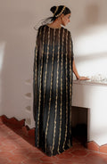 The Sadie-Black outfit is intricately embroidered and embellished with shimmering crystals and delicate chains, transforming this chiffon cape into a statement piece. A lavishly embellished neckline elevates its allure, making it a symbol of sophistication