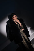 This outfits consists black velvet gown and velvet trouser paired with tasselled belt.gown is tilla embroidered and hand embellished with sequins, black and gold crystalsand cut dana.