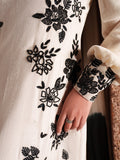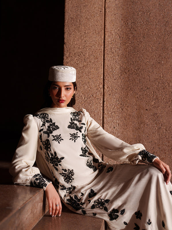 We are back with the all-time favorite black-and-white combo. A unique white dress is adorned with striking black embellishments, creating a timeless and elegant contrast. Paired with a silk long scarf featuring ombré black ends and delicate black crystal detailing, the look is completed with sophisticated charm.