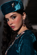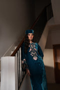 Velvet hand embroidered dress in multiple colours and embellished with pearls and cutdana, paired with organza dupatta.