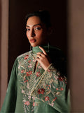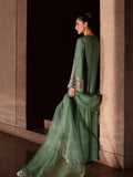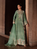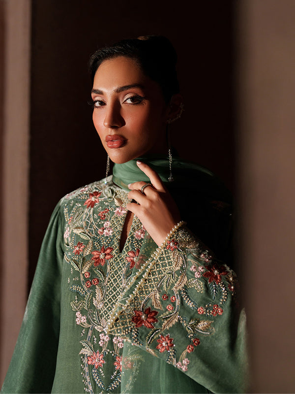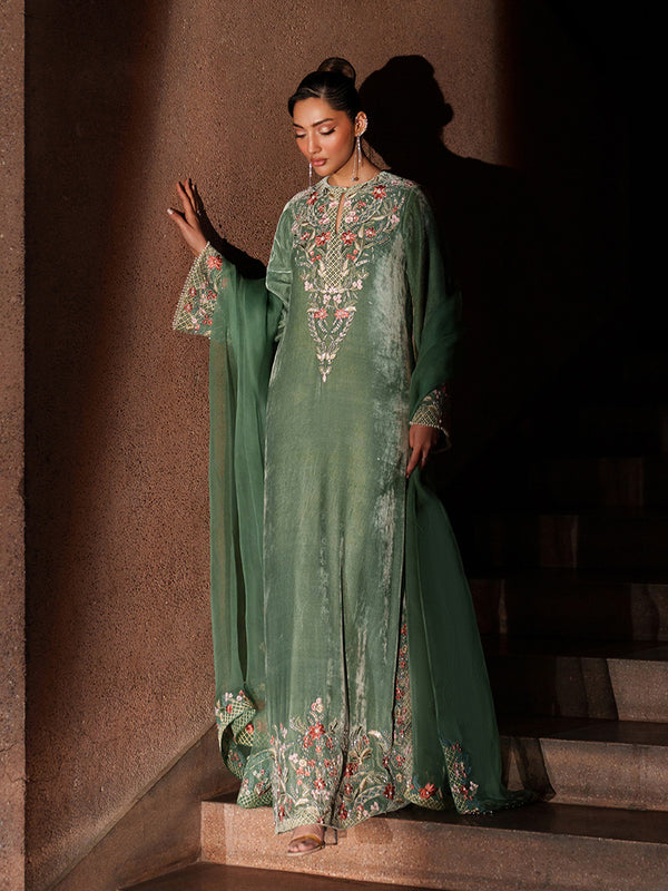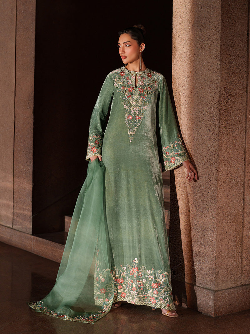 This seafoam green velvet dress is a perfect expression of daytime elegance, blending richness with a fresh, luminous feel. The subtly sparkly surface adds refined charm without overpowering the look. Paired with an embroidered and embellished organza dupatta, it gains a unique and graceful finishing touch.
