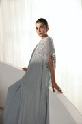 Imagine yourself gliding across the room in this exquisite gown. Crafted from the most delicate fabric, it feels like a dream to wear. The soft, pleated design flows effortlessly, creating a mesmerizing movement with every step. The shimmering blue hue is captivating, and the intricate hand embellishments on the bodice add a touch of refined elegance.