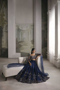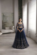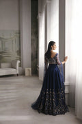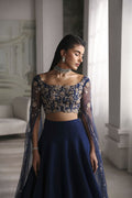 Indulge in the captivating Royal Radiance of this exquisite ensemble. This outfit features a rich sapphire blue raw silk, adorned with intricate hand embroidery, shimmering tilla work and dazzling embellishments of sequins and crystals. The sheer net sleeves add a touch of ethereal delicacy, adorned with fine embellishments that further enhance the luxurious charm.