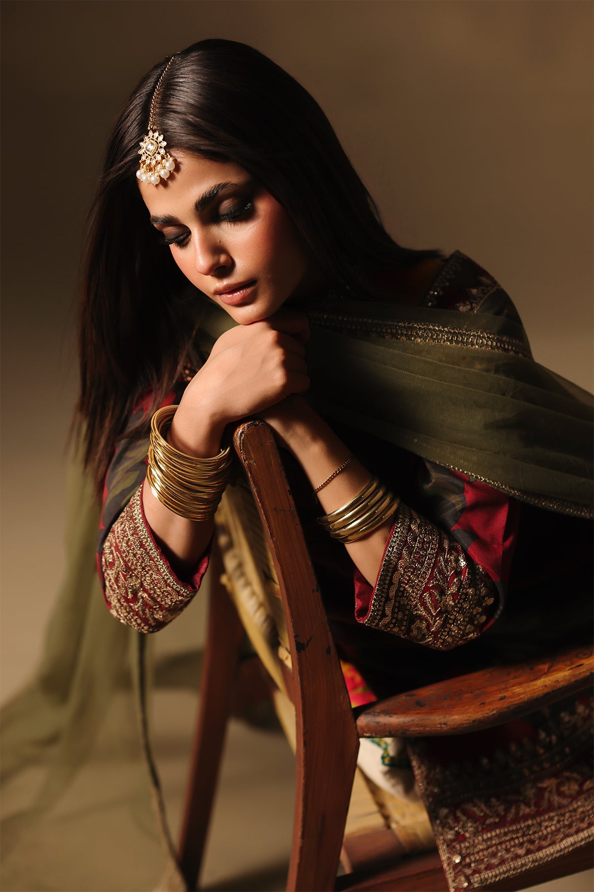 Crafted on a rich, deep wine base, the shirt features oversized botanical motifs in muted sage and crimson tones, framed with intricate tilla, resham, and antique Tilla work inspired borders.