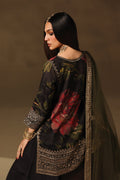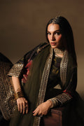 Set against a moody base, the shirt blooms with oversized botanical florals in crimson and sage, framed with antique gold tilla borders and finely detailed sleeve embellishments. Paired with a lush olive dupatta, it evokes regal grace with a contemporary spirit.