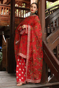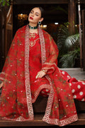 Shirt: Organza Printed Shirt with embroidered neckline,embroidered sleeves lace and embroidered front back daman/chok lace. Raw Silk Inner Shirt. Embellished with Adda Work. Finished with Stitching detail. Trouser: Raw Silk Printed Trouser with embroidered trouser lace. Finished with Stitching detail. Dupatta: Organza Printed embroidered Dupatta with 4 side dupatta pallu lace.