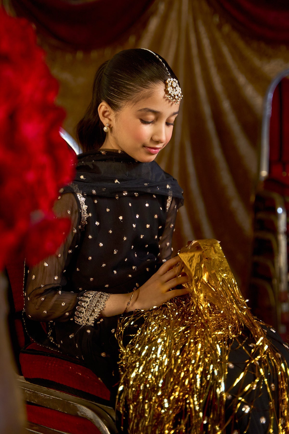 The look is completed with a matching net dupatta featuring a scattered sequin spray and an intricately finished border for a timeless, regal appeal.