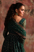 A timeless teal floor length pishwas crafted on soft net, intricately adorned with gold zari, sequin, and resham detailing throughout.