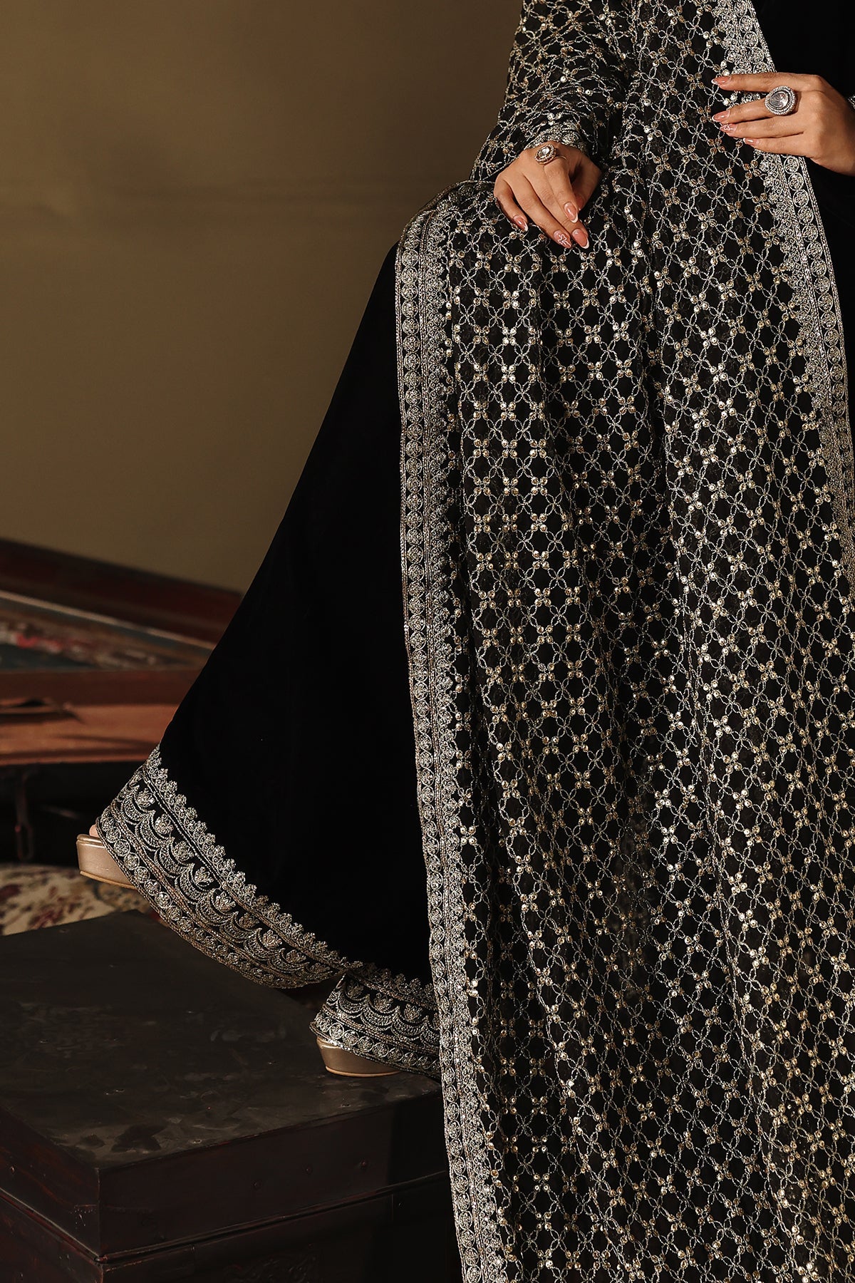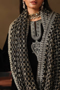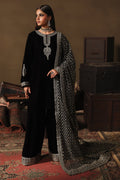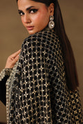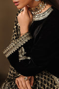 Paired with a stunning velvet farshi shalwar, beautifully bordered with intricate silver embroidery. The flowing cut and immaculate tailoring lend a luxurious finish to the ensemble.