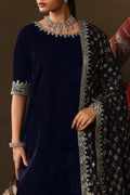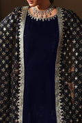 Matching navy velvet trousers tailored in a straight, easy cut. The smooth fall and polished finish keep the look effortlessly elegant.