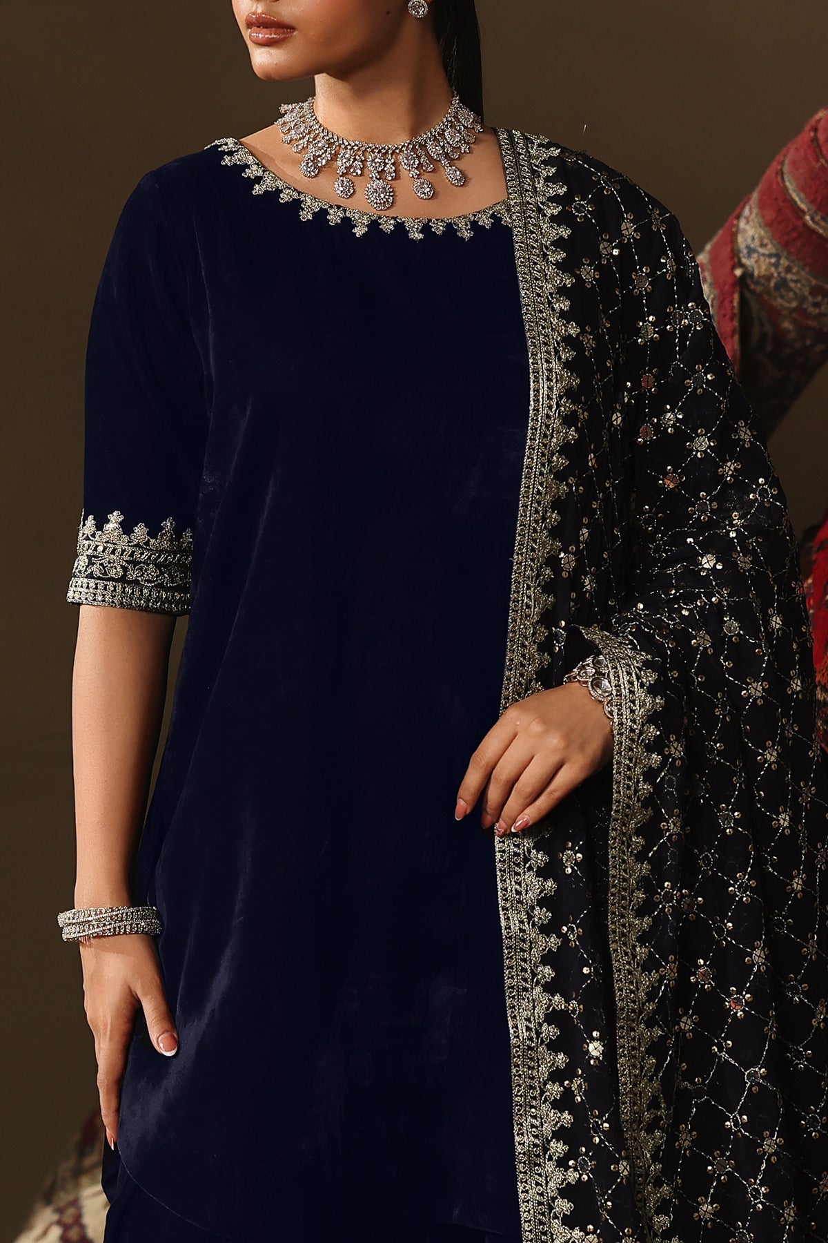 A deep navy velvet shirt designed in a clean, classic silhouette. The plush texture adds natural richness, while the delicately embellished neckline lends a touch of refined sparkle.