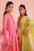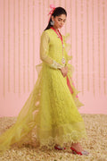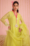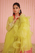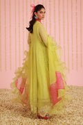 Make a statement with our premium khadi kalidar in a beautiful pear green shade. This striking piece showcases exquisite handwork with kora, dabka, and stones, adding a touch of sophistication. It is perfectly paired with matching pants and a color-blocked organza ruffle dupatta adorned with block print details and pearl edges, making it ideal for special occasions.