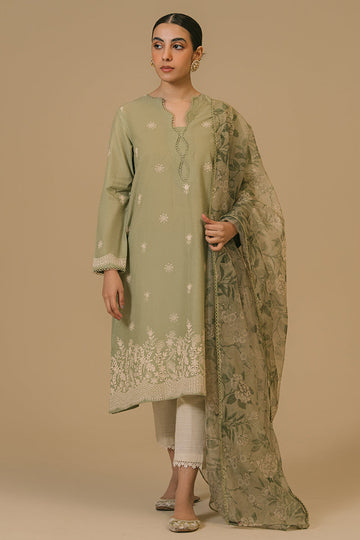 Discover elegance and style with the Olive Vista 3-Piece set. Made with high-quality cotton fabric, the front boasts intricate embroidery while the back offers a simple plain dye. The round scallop neckline adds a touch of sophistication with delicate lace detailing, And Paired with Trouser while the straight embroidered sleeves are paired with a Rajjo net embroidered dupatta.
