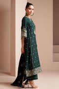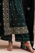The EMERALD GRACE-3 PIECE EMBROIDERED ORGANZA SUIT features a silk embroidered front, back, and sleeves, as well as an embroidered neckline. The sleeves include a 40" embroidered patti, while the front and back hem have an 80" embroidered patti. The silk dyed trouser and velvet embroidered shawl complete the luxurious and elegant look of this suit. Experience the perfect combination of style and comfort with this exquisite suit.