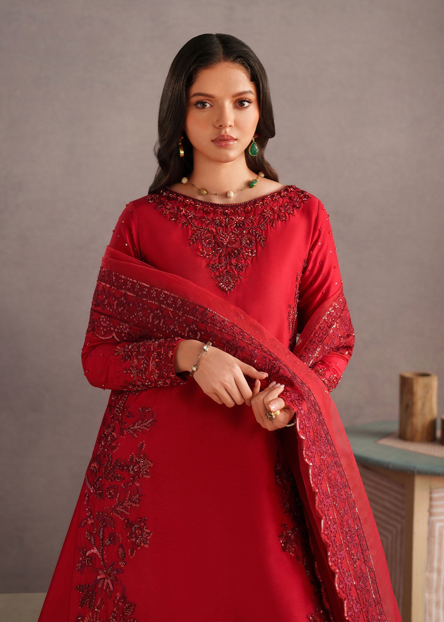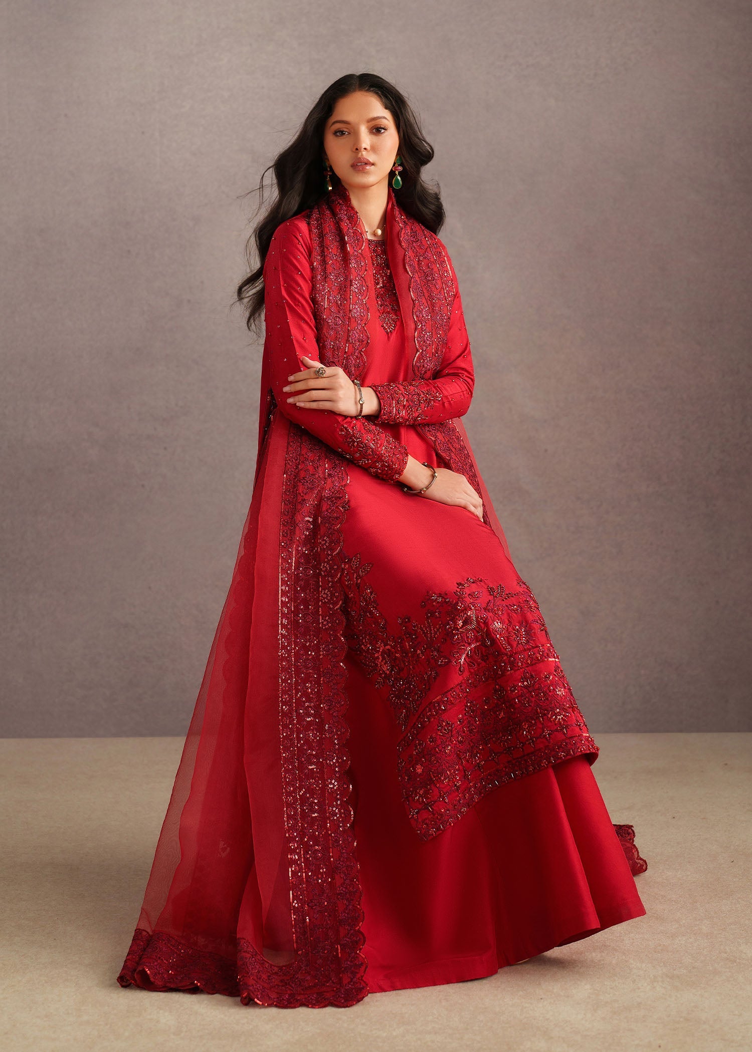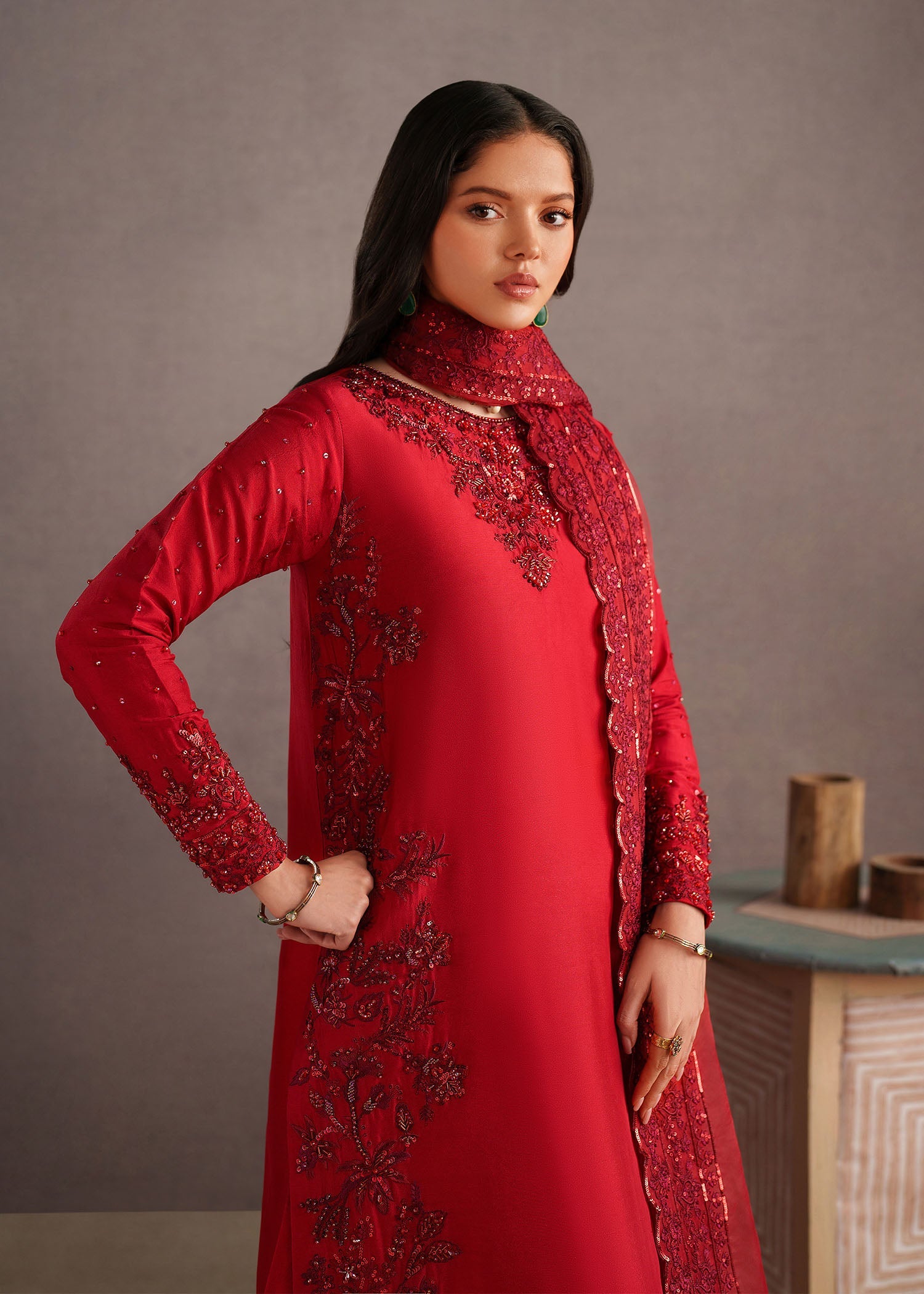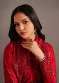 This stunning red ensemble exudes timeless elegance and festive charm. Crafted from premium-quality fabric, the outfit features intricate embroidery across the neckline, sleeves, hem, and borders, adding a luxurious and refined touch. The rich red hue is beautifully complemented by detailed thread and embellishment work, making it perfect for weddings, formal gatherings, Eid, and festive occasions.