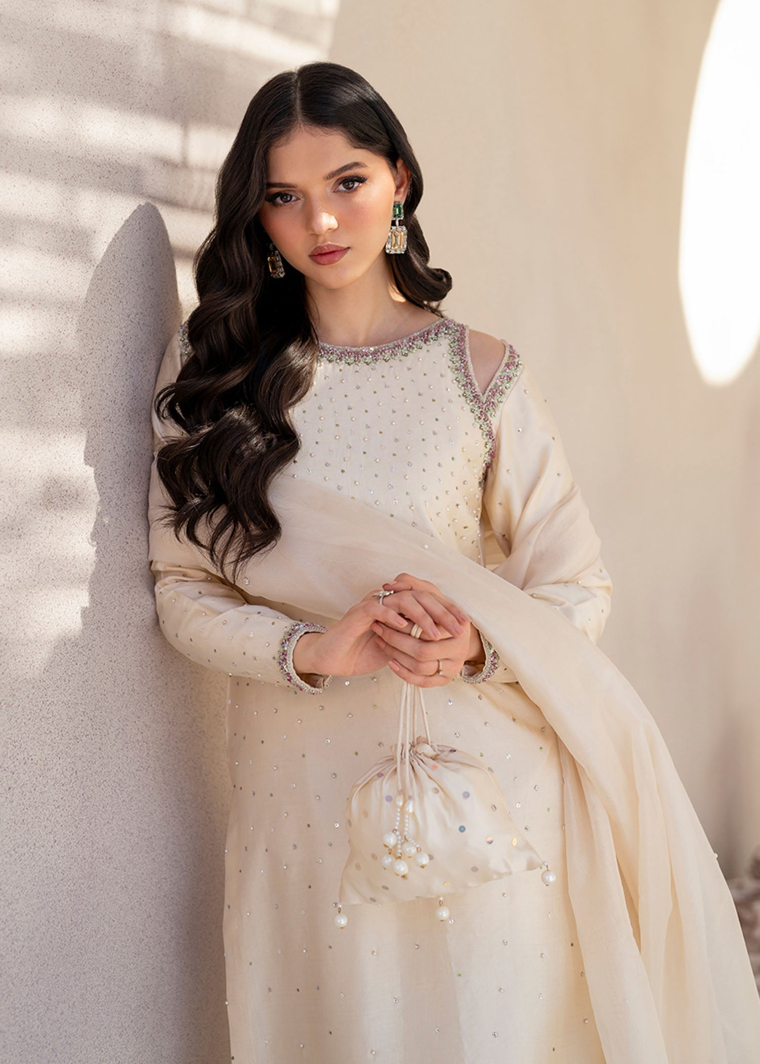 Eid is a time for classic elegance, and Guzel embodies that spirit. This off-white outfit features tissue silk fabrics, adorned with intricate hand embroidery and sequin beads, complemented by an Organza dupatta. Ideal for those who crave timeless beauty during the festive season!