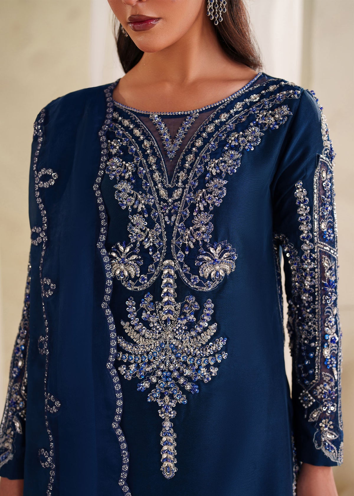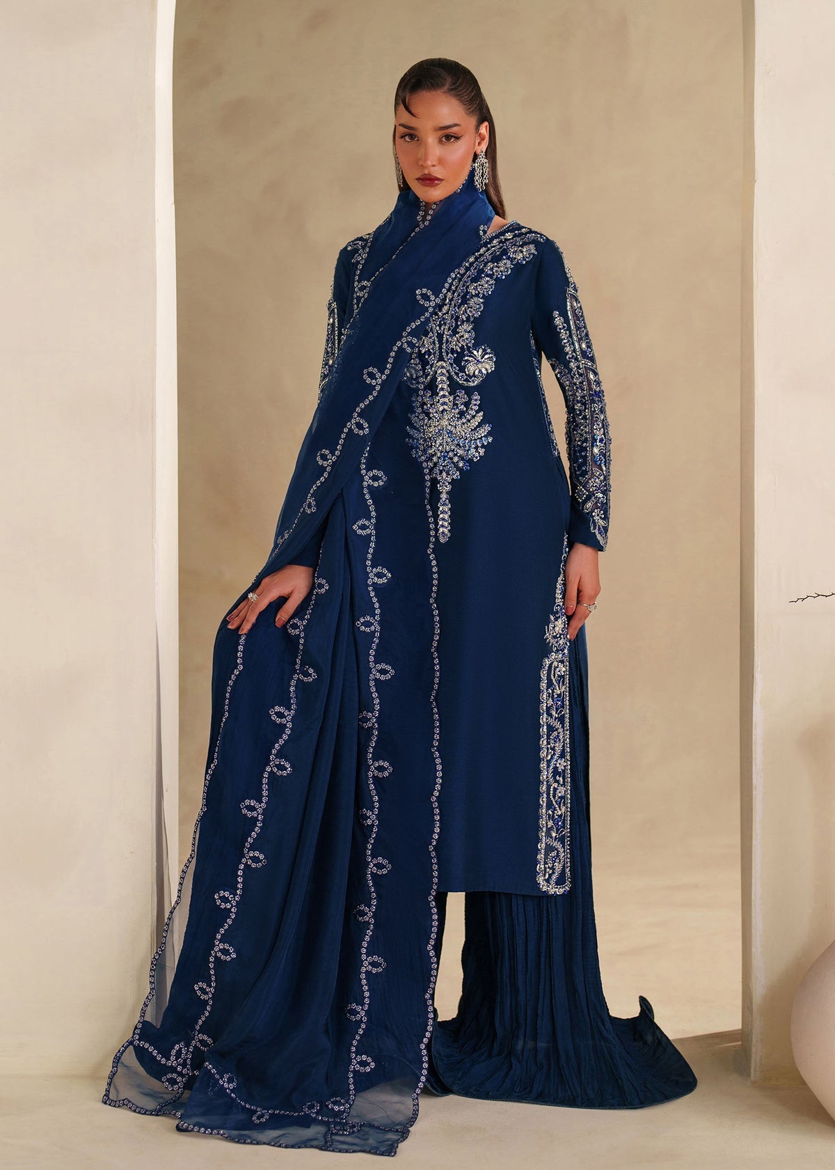 Midnight Azure brings a festive calm to this Maahi II reveal rich, luminous, and full of feeling. The fluid tissue silk shirt, finished with subtle blue accents and soft white pearls, flows effortlessly into crushed pants that move with you. Easy, expressive, and thoughtfully crafted, this one holds a special place with us quietly festive, effortlessly elegant, and honestly one of our favourites!