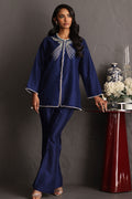This design exudes sophistication and opulence, making it ideal for evening wear or high-end formal occasions. This elegant jacket is a statement piece of couture craftsmanship, richly adorned with hand embroidery inspired by precious jewels in crystal and pearls. The jacket and pants are crafted from pure raw silk.