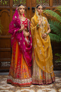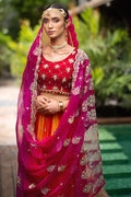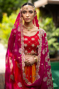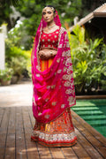 Rendered in our bespoke heritage print this lehnga is crafted in silk with extensive panels which give it the extra flare. It is hand worked in intricate resham, zardozi, gotta, stone and mirror work. The extensively hand worked choli adds to it's charm. The pure organza dupatta is hand block printed and hand worked in intricate resham, zardozi gotta and mirror work.
