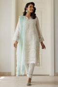 A graceful cotton net ensemble paired with a dupatta featuring delicate multi-colored machine embroidery, further enhanced with subtle silver lurex detailing. The outfit is finished with fine lace accents, creating a soft and elegant look.