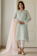 A graceful cotton net ensemble paired with a dupatta featuring delicate multi-colored machine embroidery, further enhanced with subtle silver lurex detailing. The outfit is finished with fine lace accents, creating a soft and elegant look.