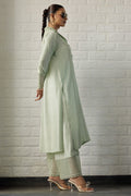 A pure raw silk shirt and trousers with cutwork detail on collar, cuffs and trousers. With hand crafted broaches. It it paired with a chiffon dupatta with scalloped lace.