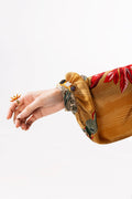 Introducing Oriane — a celebration of cultivated elegance and timeless allure, envisioned for the woman who dresses not to impress, but to enchant. Cloaked in a lustrous ochre canvas, this masterpiece comes alive with a hypnotic interplay of untamed florals and tessellated motifs in opulent crimson tones. A nod to vintage glamour, it is exquisitely accompanied by a pure silk dupatta — a rich, spice-infused composition that evokes far-flung grandeur.