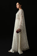 Voile d'Argent—a breathtaking vision of celestial pearl sophistication. This ethereal creation merges modern allure with timeless luxury, crafted from lustrous organza layered over delicate netting, and adorned with a striking floral laser-cut detail that adds captivating drama to its silhouette. A crystal-embellished bow neckline graces the design, imbuing it with an air of refined opulence. Each cascading layer catches the light in a soft, mesmerizing shimmer, enhancing the gown's graceful flow. Paired with tonal pleated pants, Voile d'Argent is the epitome of understated glamour—ideal for an evening steeped in elegance or any occasion demanding true opulence.