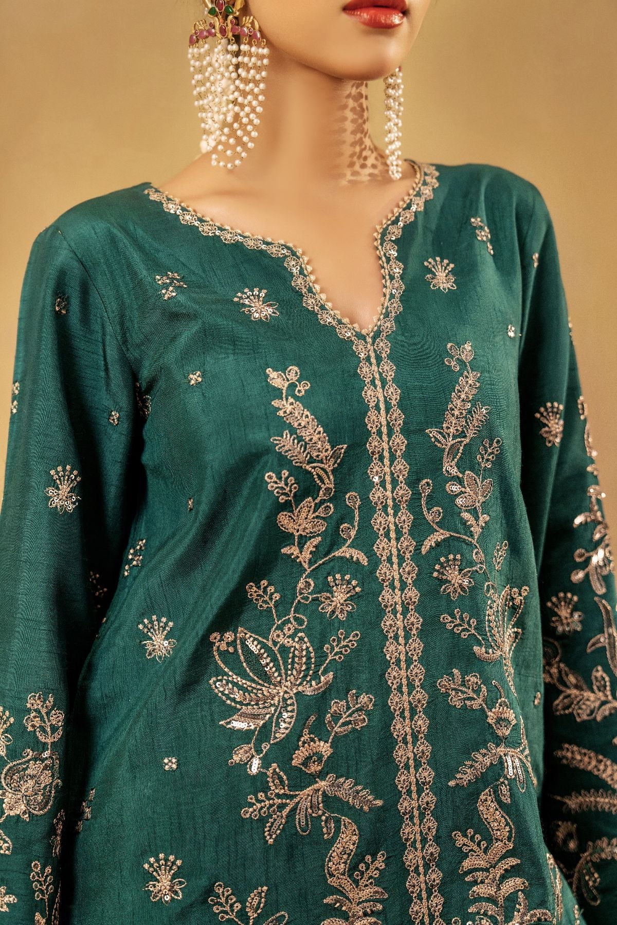 1) Embroidered rawsilk front 1 2) Embroidered rawsilk back 1 3) Embroidered rawsilk sleeves Left,Right 4) rawsilk trouser 2.5 yard 5) Embroidered trouser border 1.5 yard 6) Embroidered organza duppata 3 yard