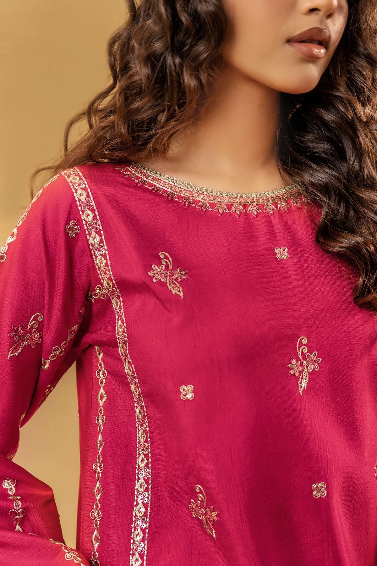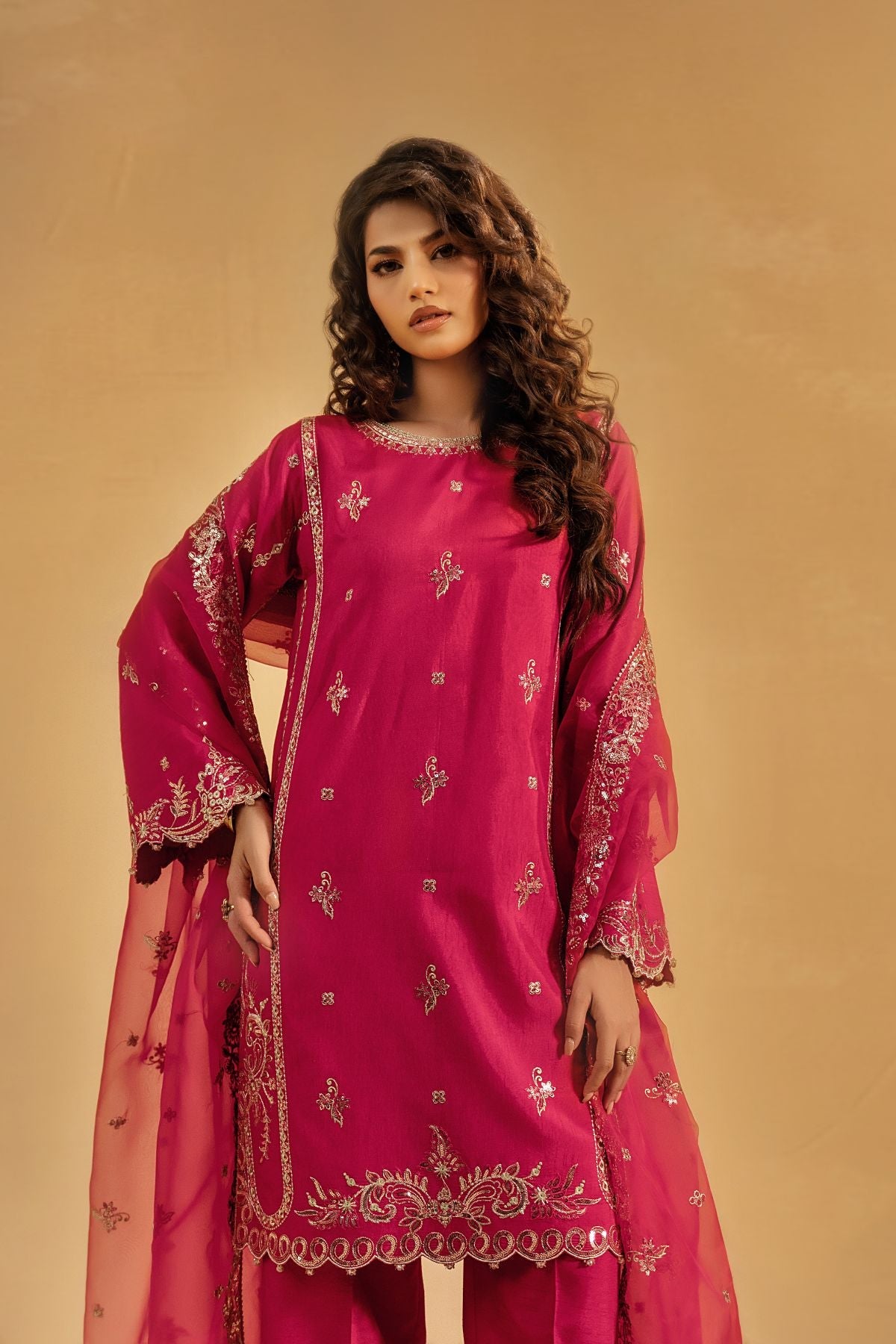 1) Embroidered rawsilk front 1 2) Embroidered rawsilk back 1 3) Embroidered rawsilk sleeves Left,Right 4) rawsilk trouser 2.5 yard 5) Embroidered trouser border 1.5 yard 6) Embroidered organza duppata 3 yard