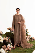 Embody elegance in this luxurious brown ensemble crafted from premium Korean raw silk. The long shirt features detailed loops and stitching along the panels, paired with delicate embroidery for a timeless, textured look. Matching culottes with an embroidered border offer a flattering, seamless flow. A sheer organza dupatta, adorned with intricate embroidery, completes the outfit with a graceful contrast, perfect for refined occasions.