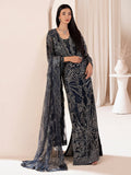 Feu a deep blue ensemble of sarong dress, jacket, and dupatta, Feu is a vault of artisanal splendor. Gilded Tilla work and cut dana shimmer under the glow of batki, pearls, and crystals. A constellation of sequins and stark white florals dances across the fabric, crafting a mesmerizing symphony of texture and light. This is wearable artistry a treasure of midnight allure, realized in the hush of moonlight.